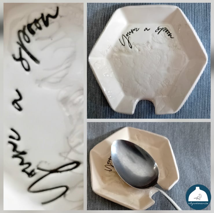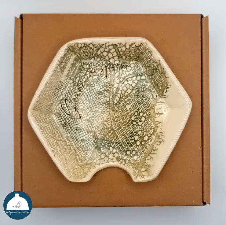 Ceramic spoon rest handmade by me. Each wee dish has been imprinted with lace and hand stamped with the Northern Irish phrase "You're a spoon". The detail has been highlighted in a leaf green colour.