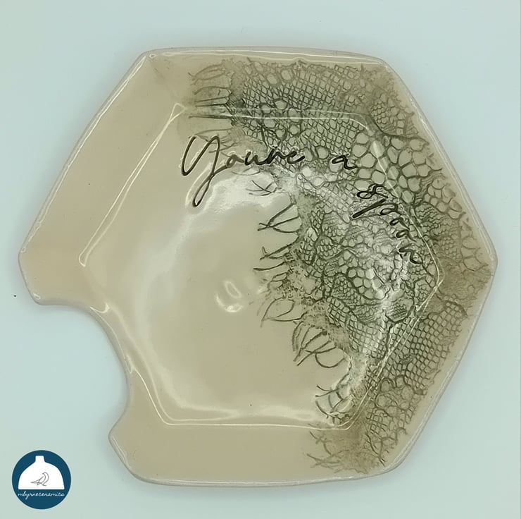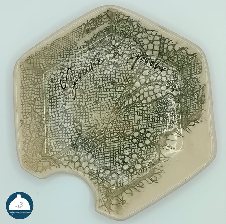 As this is a handmade item the dish has a random placement of lace so may appear slightly different from the image and in so doing creating a unique item.