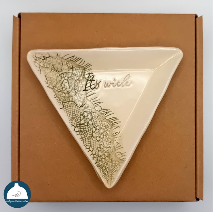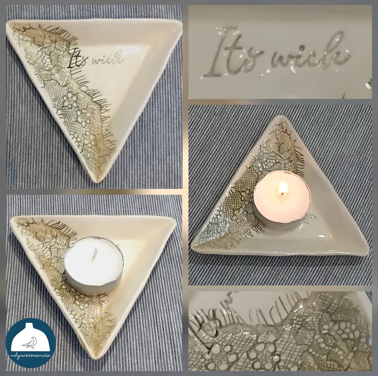 Ceramic votive holder handmade by me. Each wee dish has been imprinted with lace and hand stamped with the Northern Irish phrase "It's wick". The detail has been highlighted in a leaf green colour.