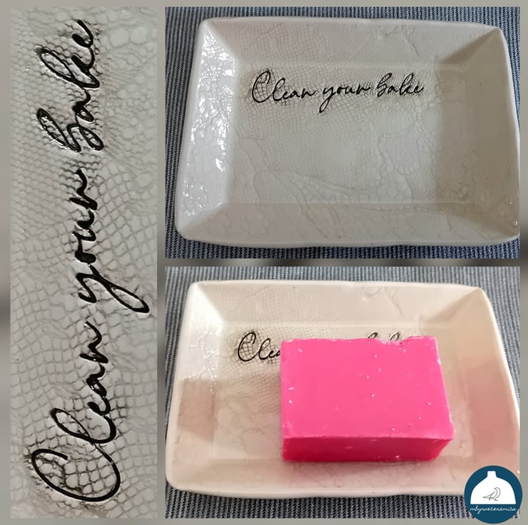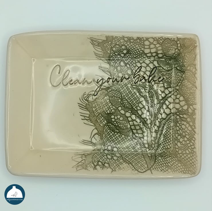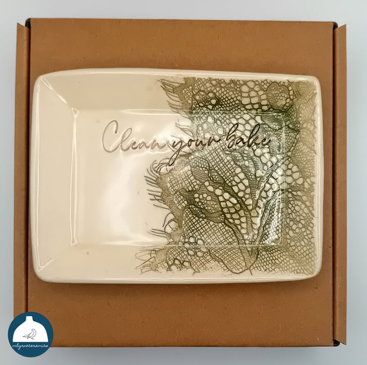 Ceramic dish handmade by me which could be used to hold soap or a sponge or whatever your heart desires . Each wee dish has been imprinted with lace and hand stamped with the Northern Irish phrase "Clean your bake". The detail has been highlighted in a leaf green colour.