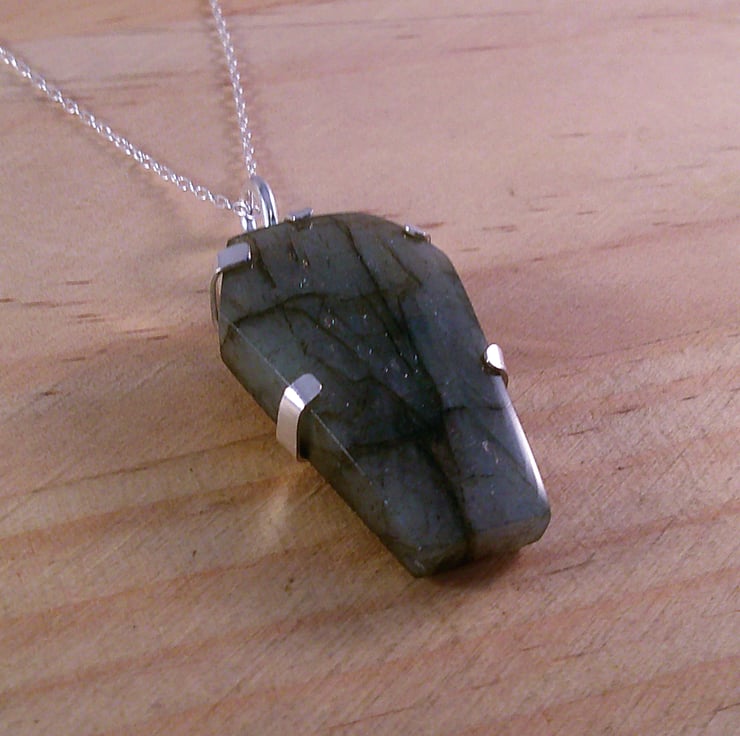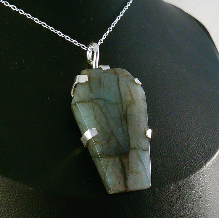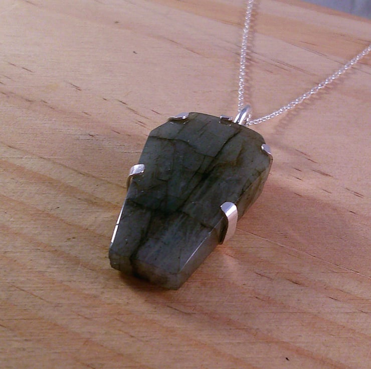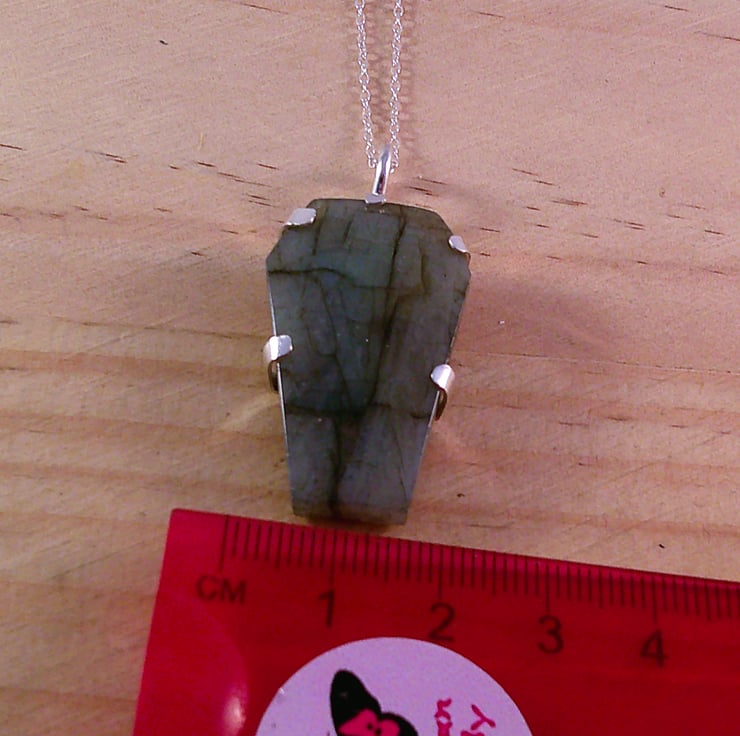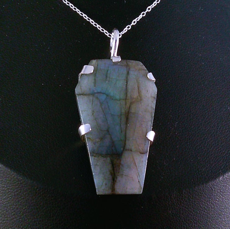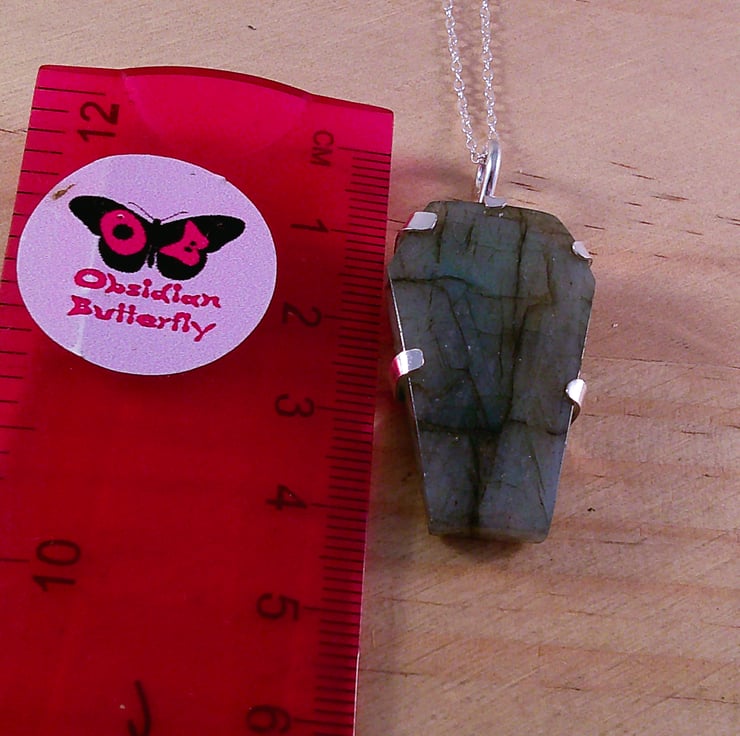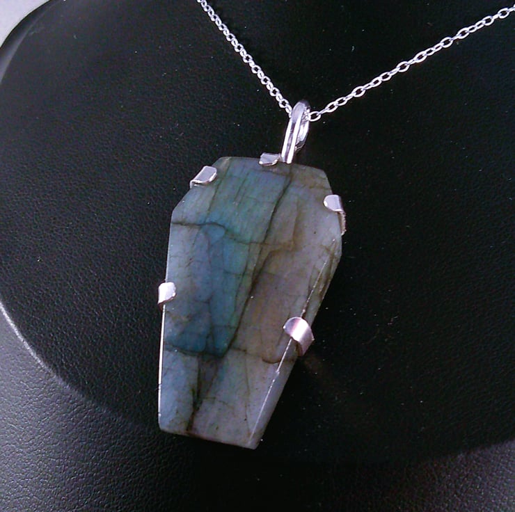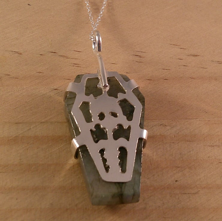 A setting for the Labradorite coffin stone has been hand pierced from a sheet of 100% recycled sterling silver, and a skull and spine pierced in the back. A wire loop has been soldered to the top and the Labradorite coffin set in the silver.