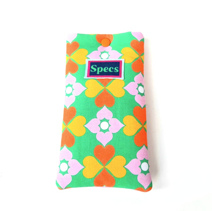 This stylish fabric glasses pouch has a colourful front featuring our own design fabric and a fun Specs label, a plain pink cotton back and lining. It is nicely padded to protect glasses from getting scratched and dusty and would make a nice gift or treat for yourself. Fits average size glasses, please check your glasses for size before purchase.