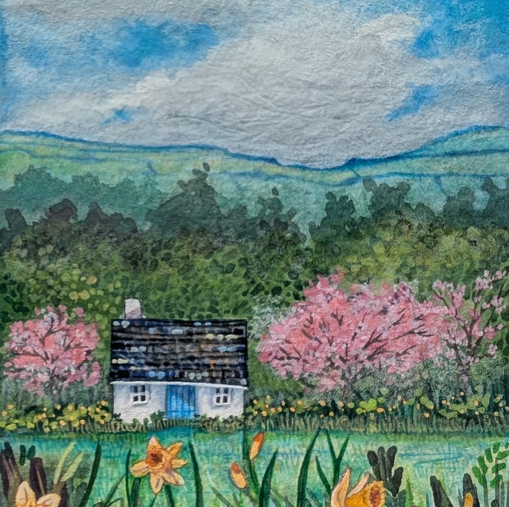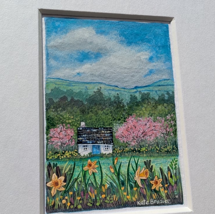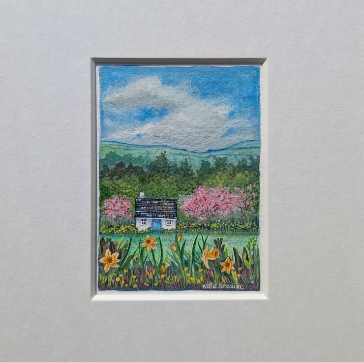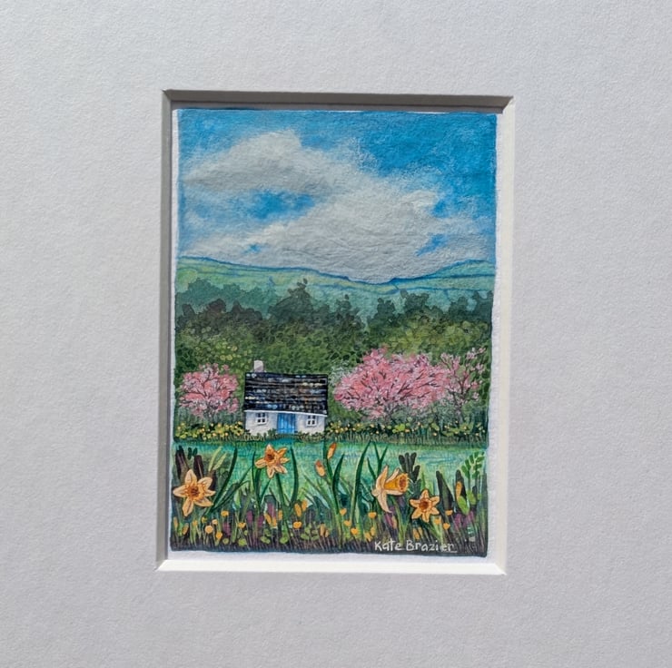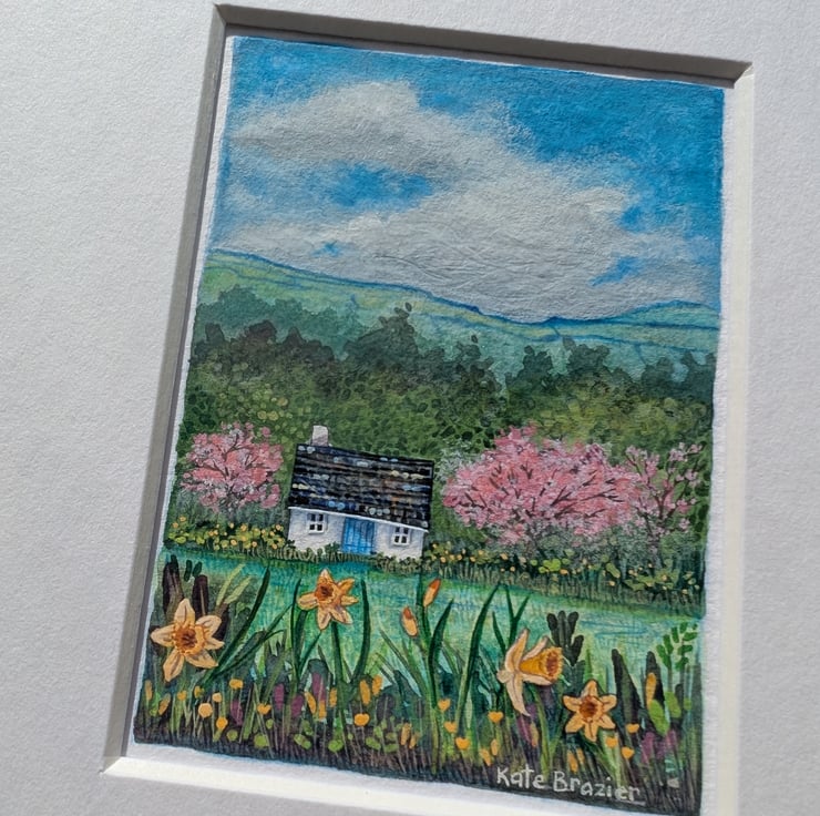 'Daffodil Cottage' is a mixed media miniature mounted into a custom A5 mount.