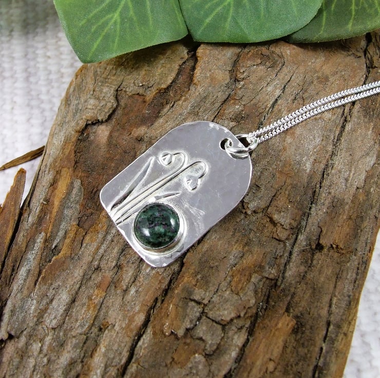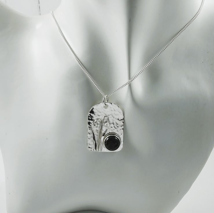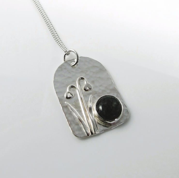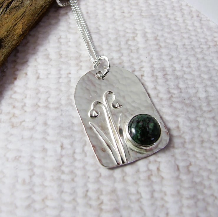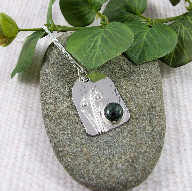 I have made cut the arch shape from sterling silver sheet and hammered for texture. To create the snowdrop flowers I melted the end of individual wires, forged cut and shaped into each flower and then soldered in place. The leaf is hand drawn and cut from silver sheet all soldered securely in place.. Alongside the snowdrop I have added a bezel setting for a 10mm ruby zoisite gemstone.
