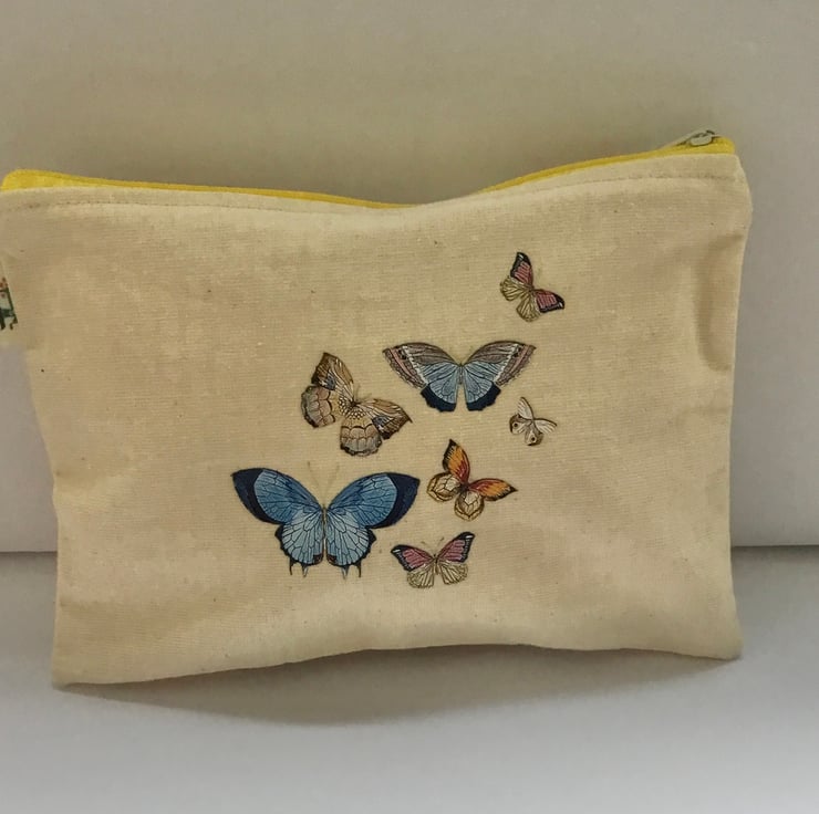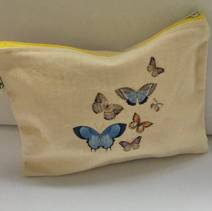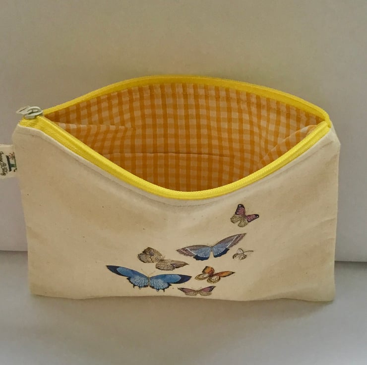 This everyday makeup bag is made up of a calico fabric with a butterfly transfer.