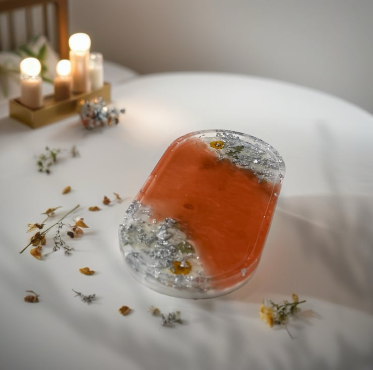 Bring a fresh pop of color to your space with this stunning handmade resin trinket tray. Featuring a warm coral-orange center that softly blends into clear resin edges, this piece is both modern and elegant.
