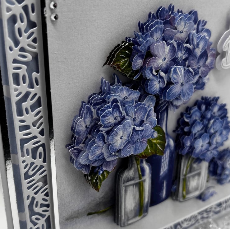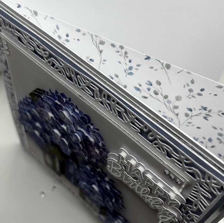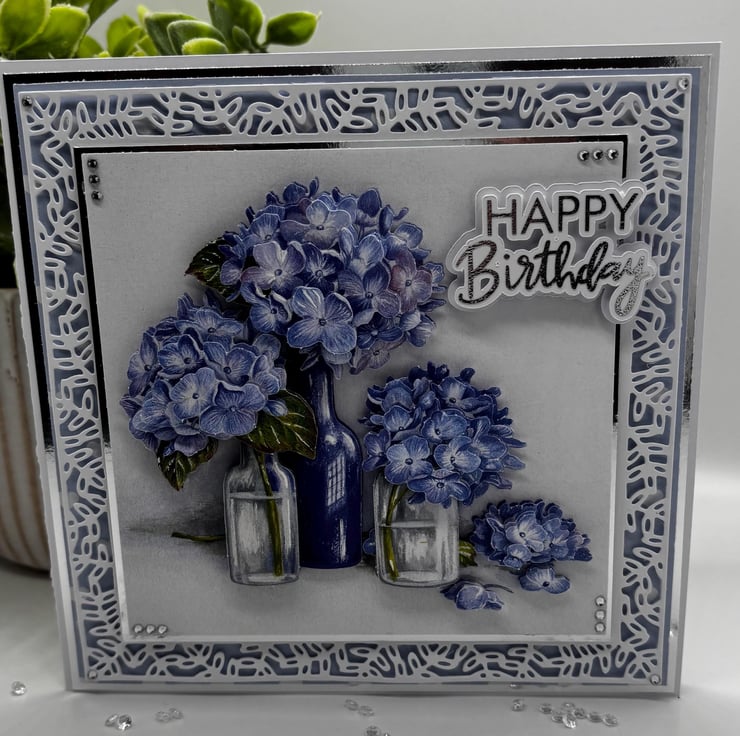 A handmade Birthday card, in the traditional standing form with a paper sentiment inside. 'Katy Sue' decoupage elements of hydrangea flowers in vases have been used to create this card which is dimensional, the die cut layers are also raised by using sticky foam pads.