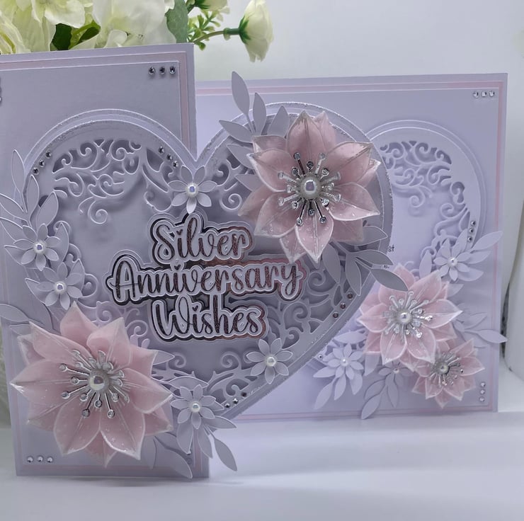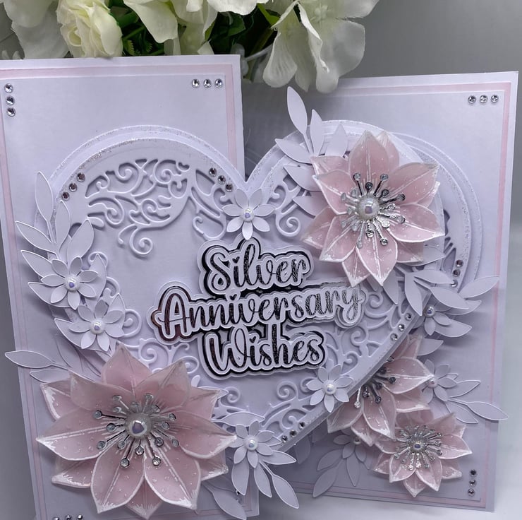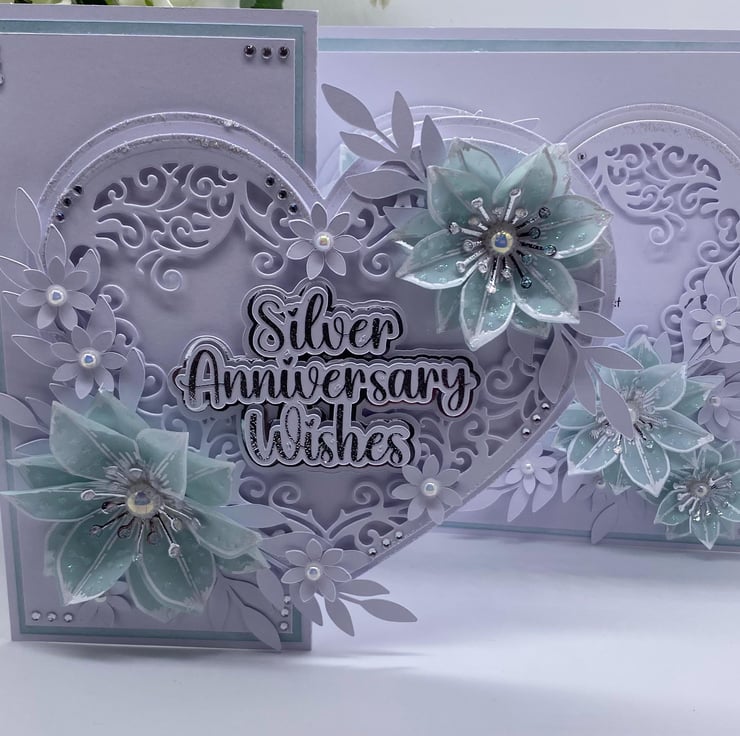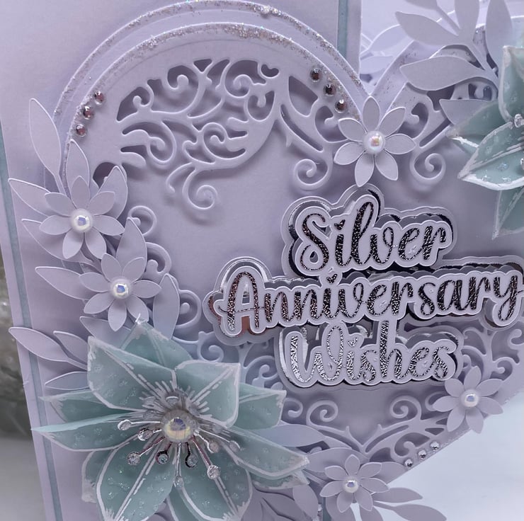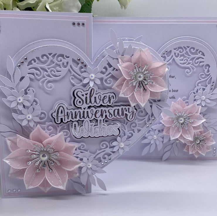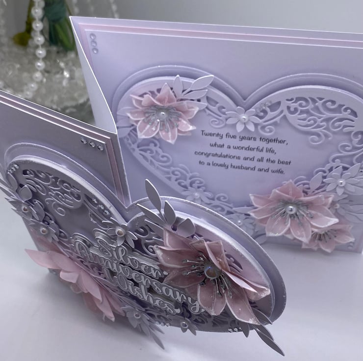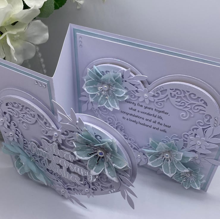 Both hearts have been die cut and layered up to give it the 3D look. You have the choice of adding names to the card, and there is a section where you can do this (at no extra cost) they will also be silver and white. The wording for the front 'Silver Anniversary Wishes' comes in two similar fonts (style of writing) but with all my makes, you will always get the best quality and make each time.
