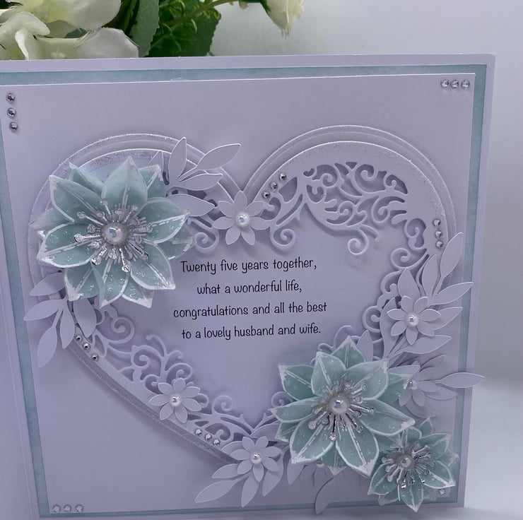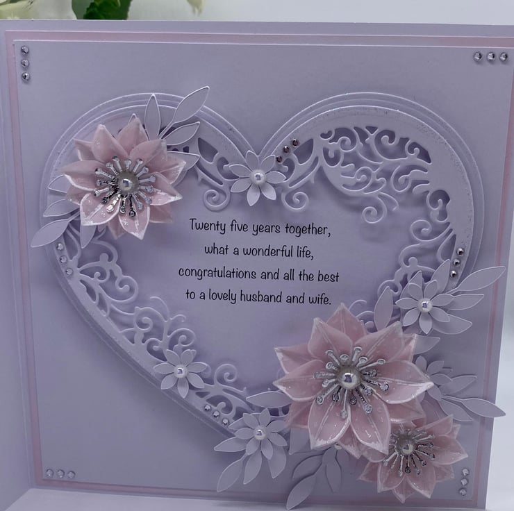 A stunning Silver anniversary card - celebrating 25 years of married bliss, with a sentiment included within a heart.