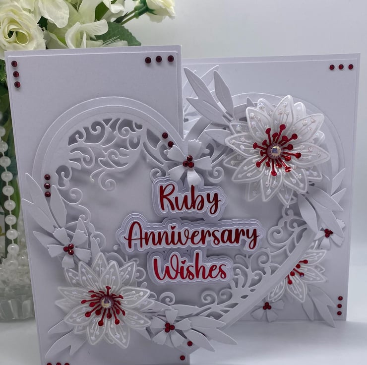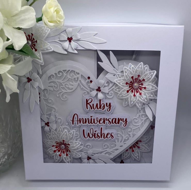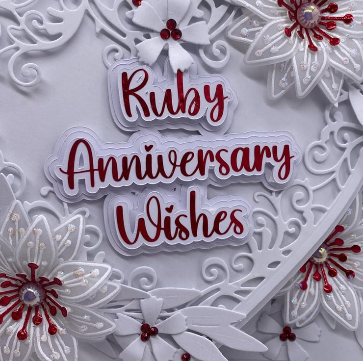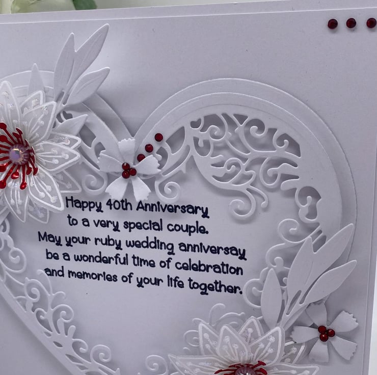 A stunning Ruby anniversary card - celebrating 40 years of married bliss, with a sentiment included within a heart.