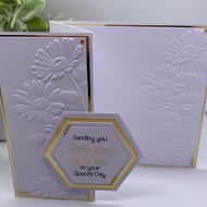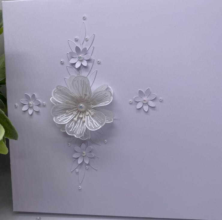 This card comes in a handmade box and is a traditional standing card with a lovely verse inside . The wording has been cut out of textured vinyl and the new design of flowers are made from vellum and heat embossed with embossing powders then formed and curled with a glittery stamen and a pearl for the centre.