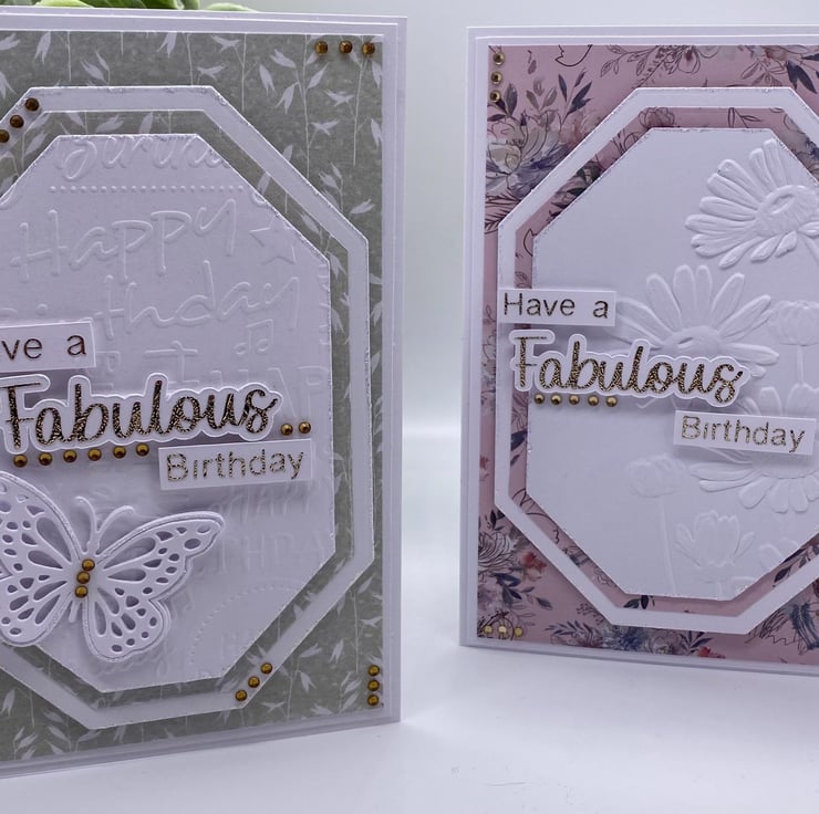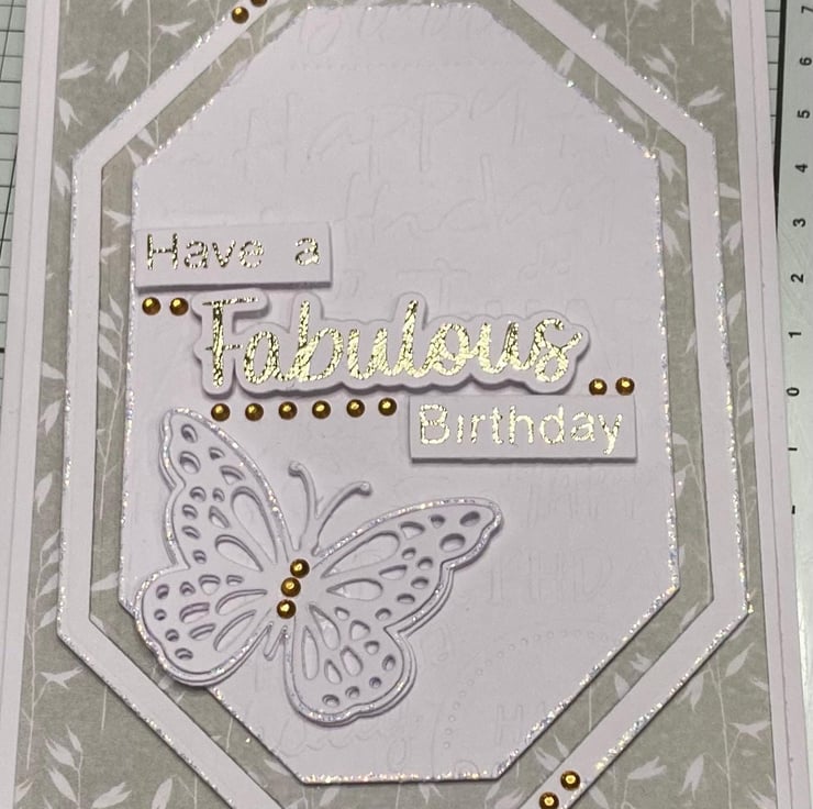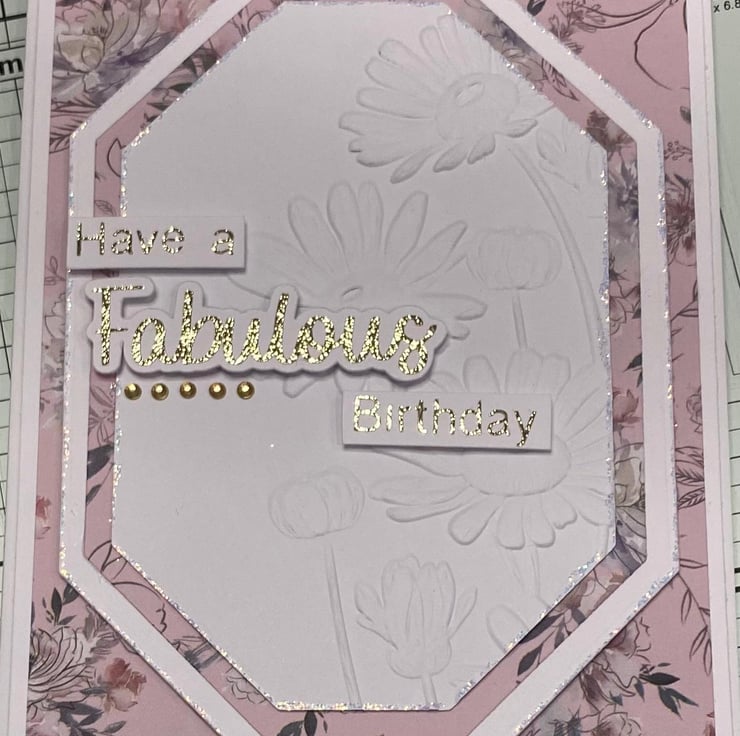 This card fits nicely into an envelope and stands like a traditional card. The 'Have a Fabulous Birthday' has been designed and cut using a cricut machine in a gold textured vinyl.