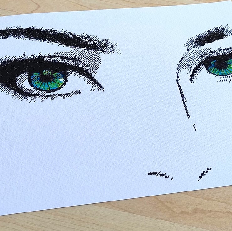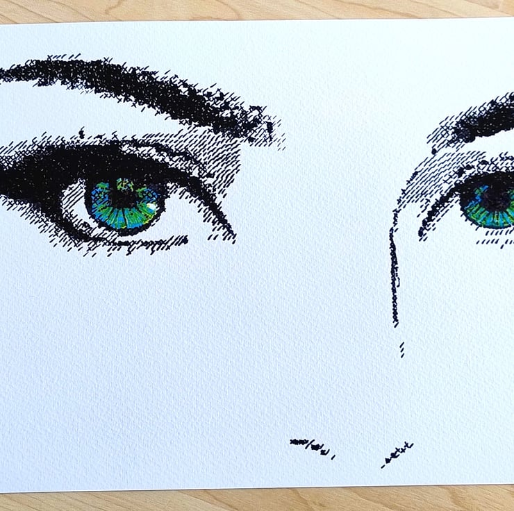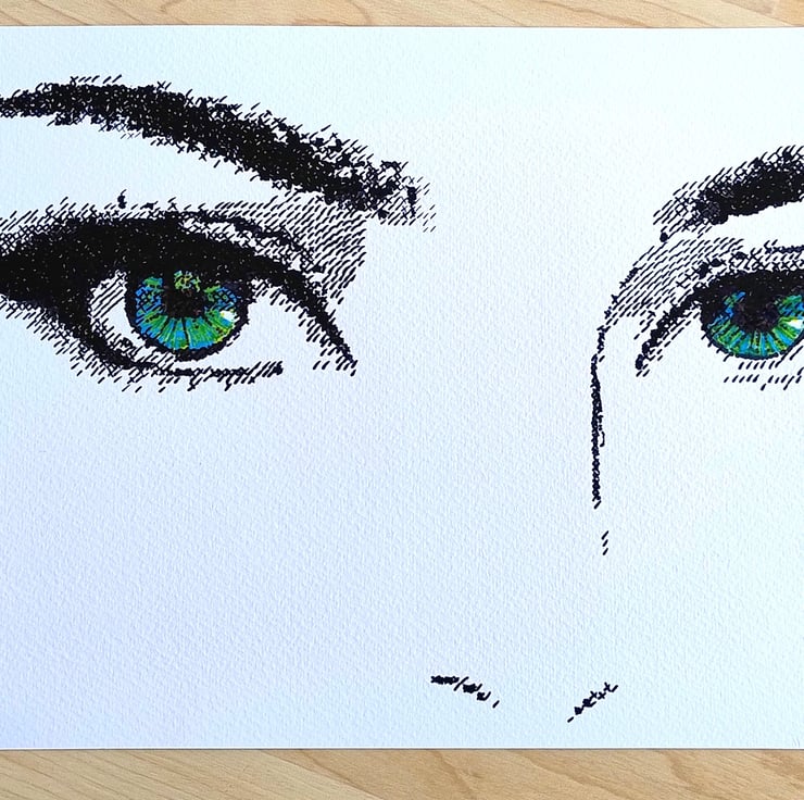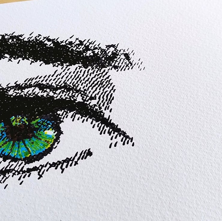 This original pen-on-paper drawing captures a pair of piercing green eyes using a unique "dithered" technique. Inspired by the limited graphical capabilities of 1980s computer games, the image is built entirely from a meticulous series of hand-drawn dashes, crosses, and hatches.