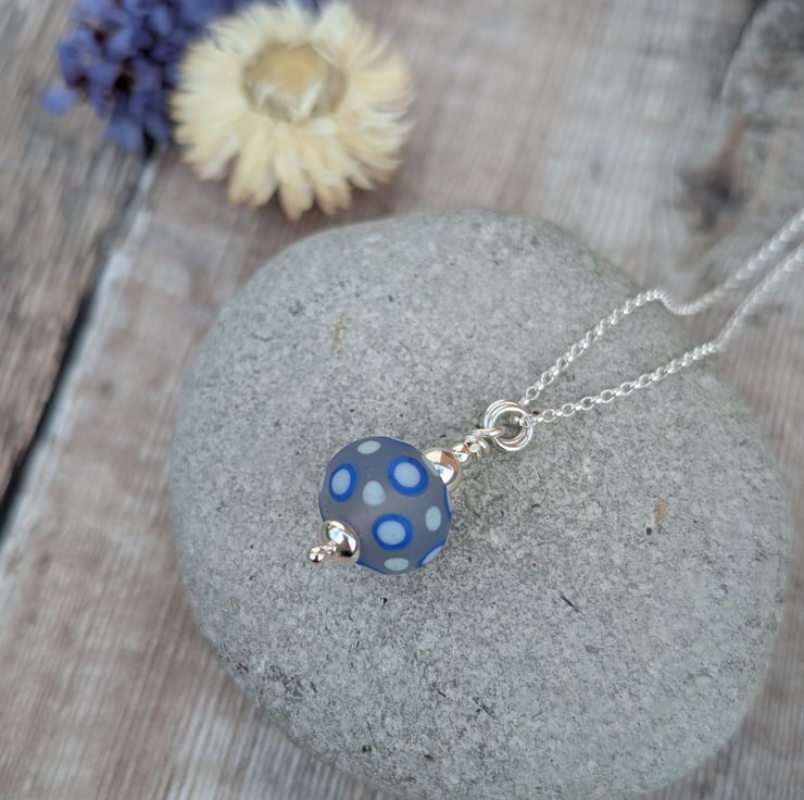 RECYCLED STERLING SILVER BLUE SPOTTY LAMPWORK GLASS NECKLACE