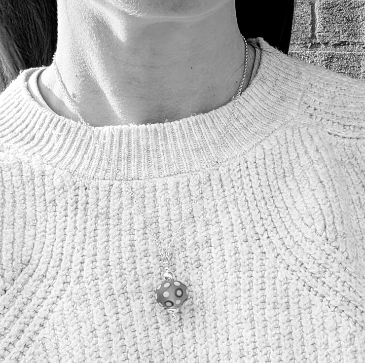 The Blue Spotty Lampwork Glass Necklace features a handmade Lampwork glass bead with soft blue spots. The bead is paired with a recycled sterling silver chain and fittings, creating a simple piece that’s easy to wear every day. Made by hand using recycled materials, this necklace is a thoughtful choice for a birthday, milestone gift, or just because.