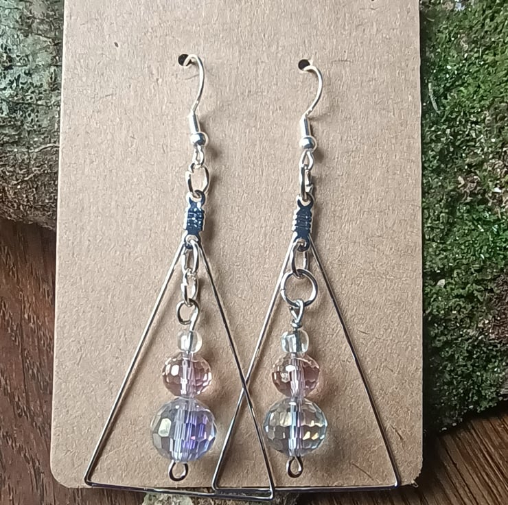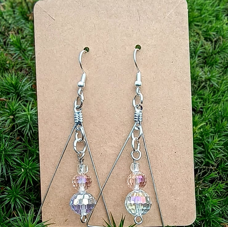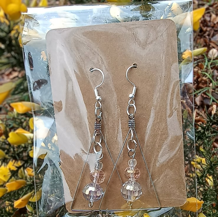 Featuring a combination of two sparkly, multifaceted beads (pale icy pink & clear) and a tiny clear dewdrop bead, suspended within a silver coloured wire isosceles triangle.