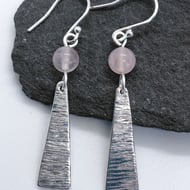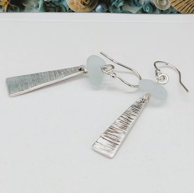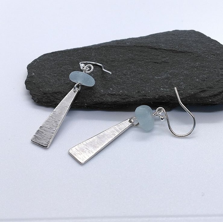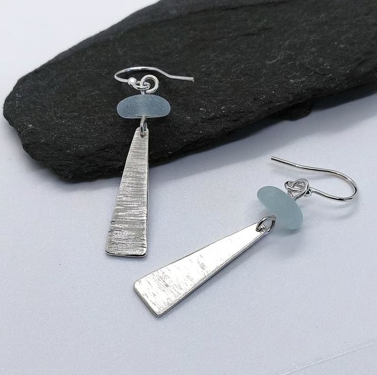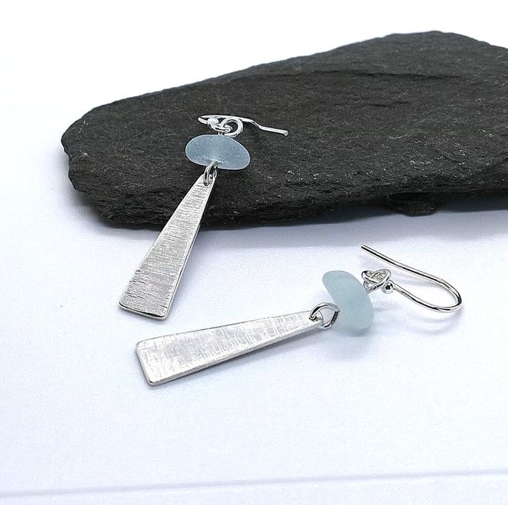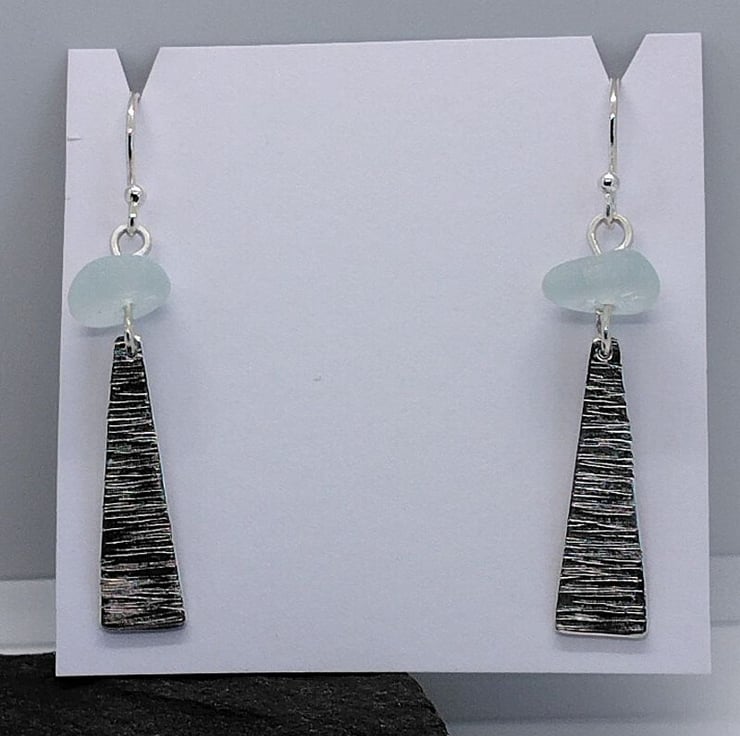 Aqua green seaglass sterling silver elongated triangle earrings with sea ripples texture.
