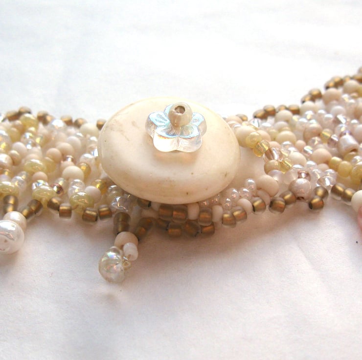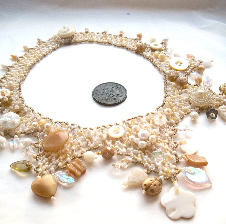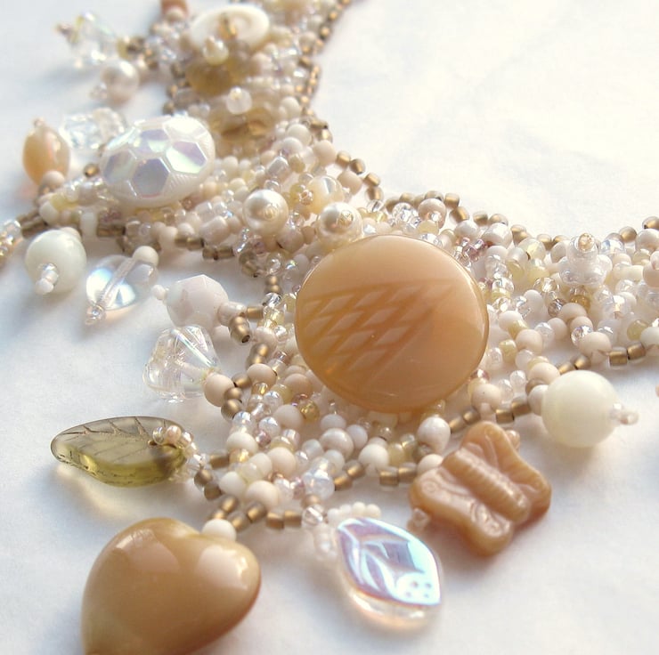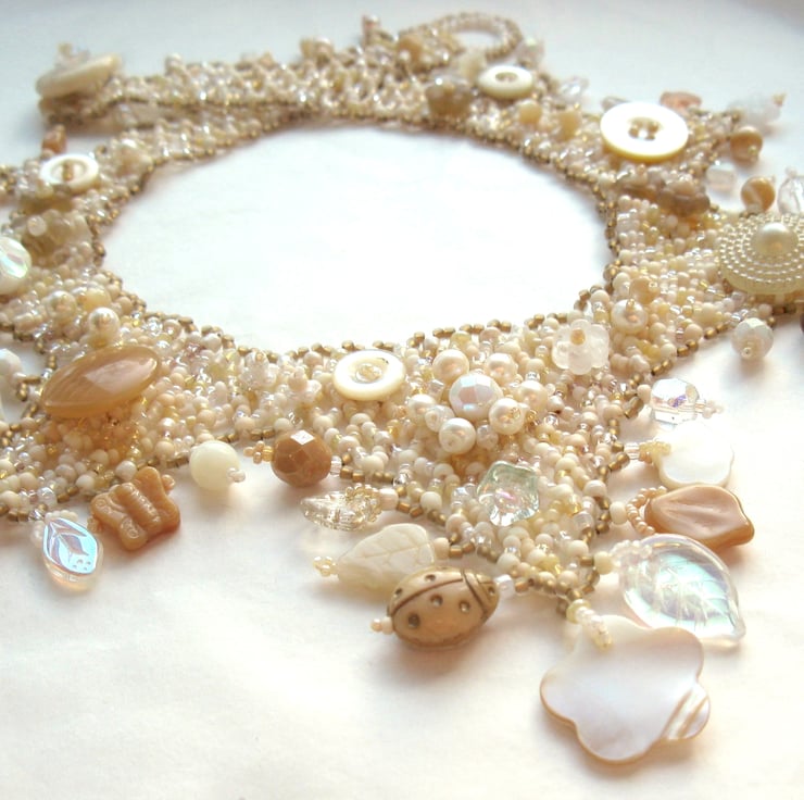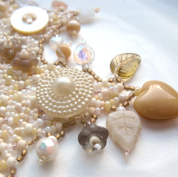 A pretty beaded collar necklace in white, beige, old gold, pearly shades and creams, adorned with beaded flowers and an eclectic assortment of pearls, glass beads and vintage buttons. Stitched by hand a few beads at a time, no two of these necklaces are ever exactly alike.