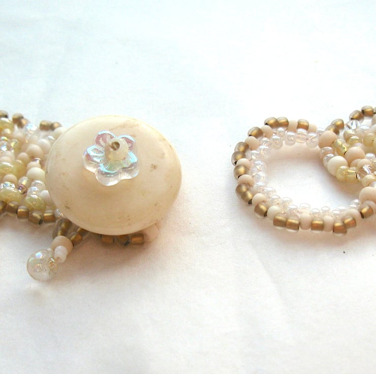 The 'Marie Antoinette' collar was one of my most popular patterns in my previous life as a beadwork designer, and it's still one of my favourites. This version measures approximately 18" (46 cm) long and 3" (7.5 cm) deep at the centre front. It fastens with a vintage polished bone button and a beaded loop.