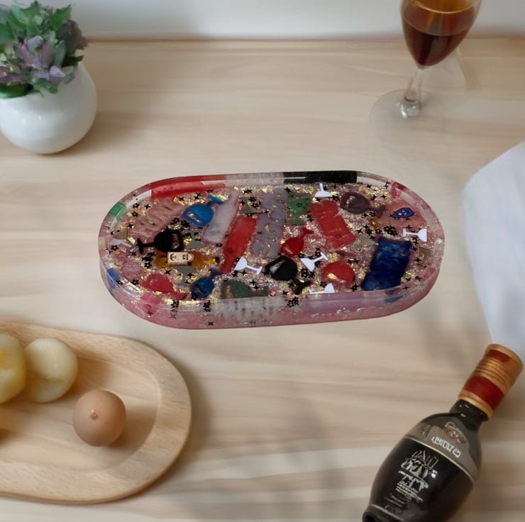 Celebrate your love for wine in style with this fun and eye-catching handmade resin trinket tray. Designed in a smooth, rounded rectangular shape with raised edges, this tray features a clear, iridescent base filled with colourful wine-themed embellishments.