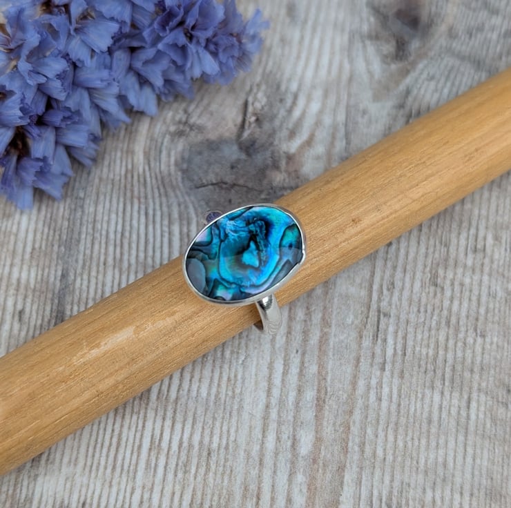 RECYCLED STERLING SILVER BLUE PAUA SHELL RING - UK SIZE P - SECONDS