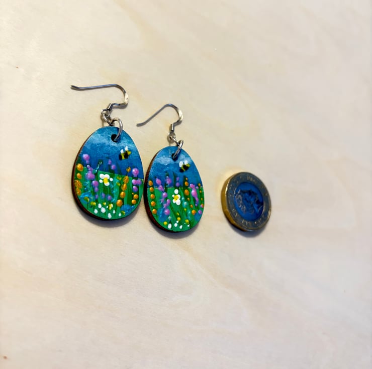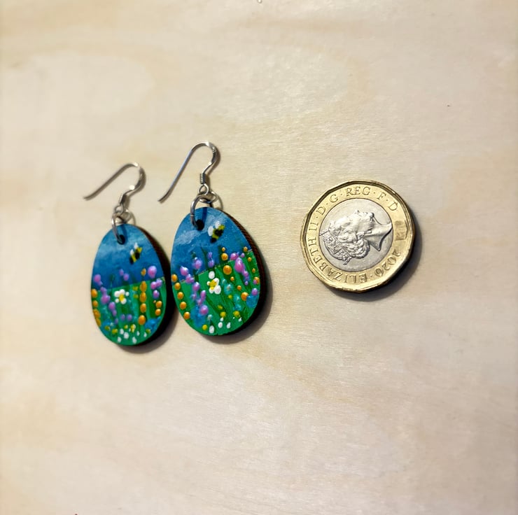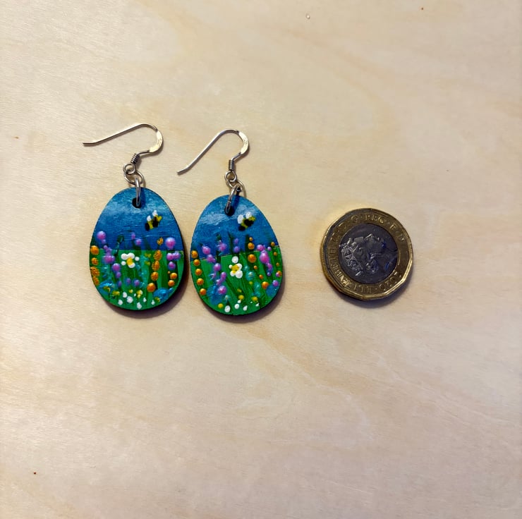This is a pair of hand painted earrings depicting a wildflower meadow with a cute bumblebee flying above. The painting was done with acrylic paint and varnished. The backs of the earrings are a solid green. The earring fish hooks are Sterling Silver - stamped 925. The earrings are lightweight and very eye-catching. Perfect for the sunnier days that we are all waiting for! :)