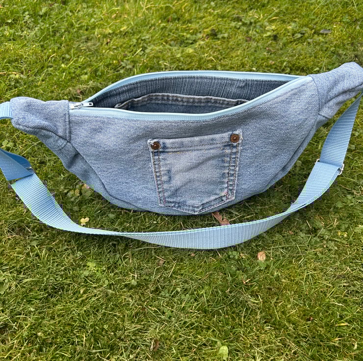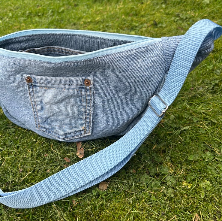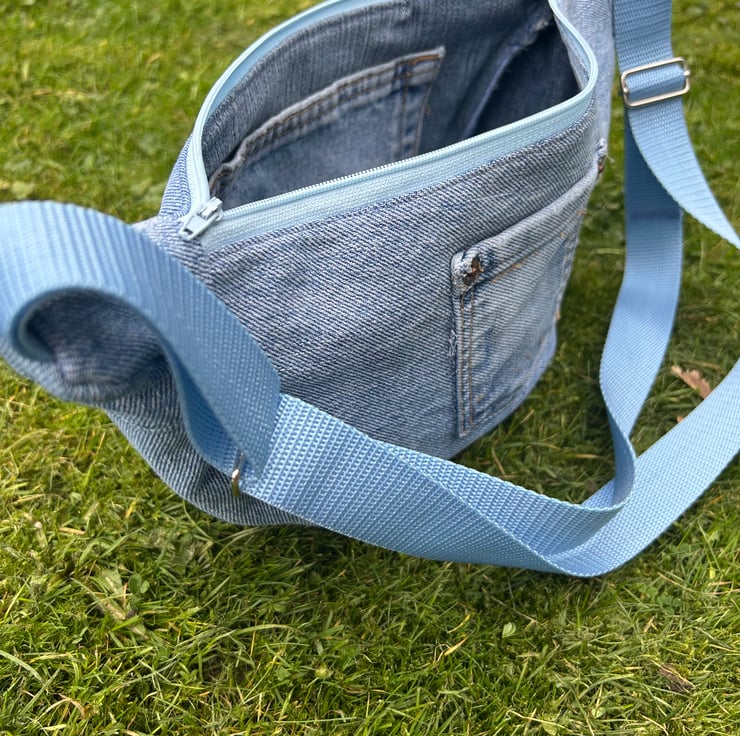 Cross body slouch bag upcycled from a pair of denim jeans.