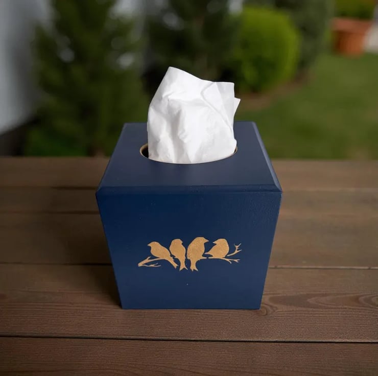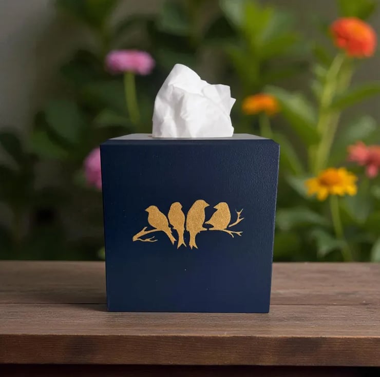 Handmade blue & gold birds on branch cube tissue box cover