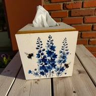 Handmade blue delphiniums & bumblebees tissue box cover