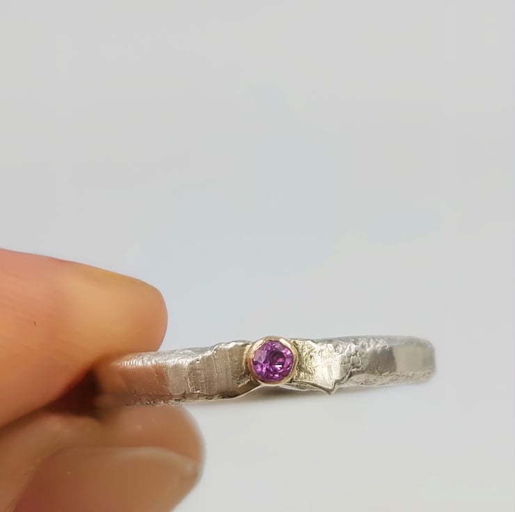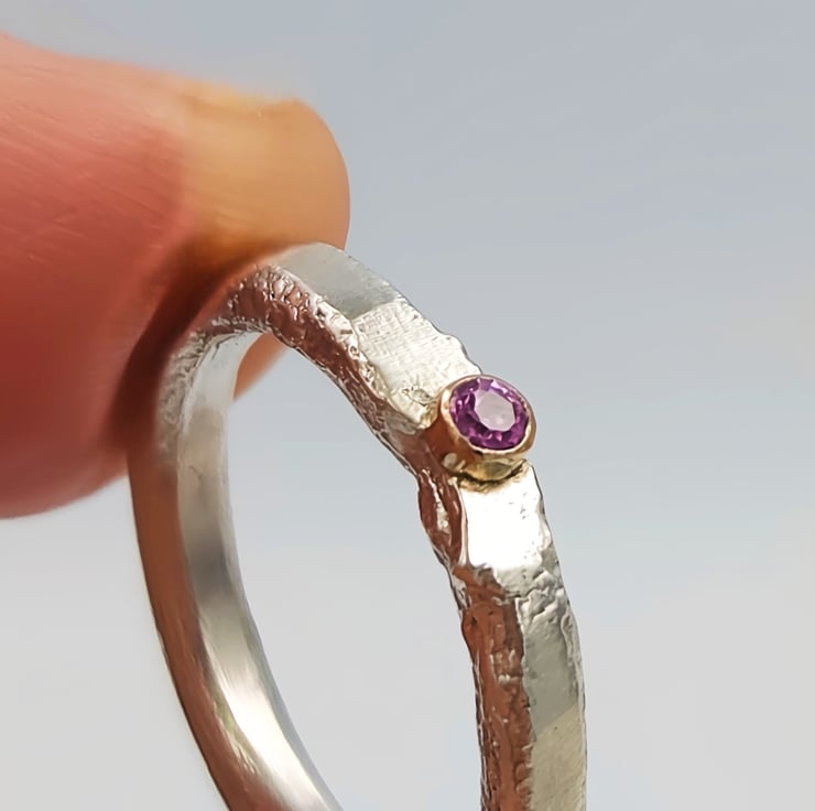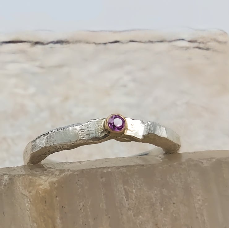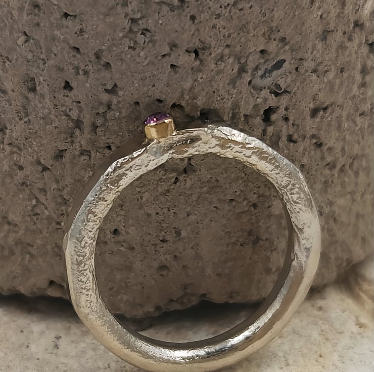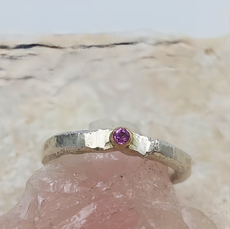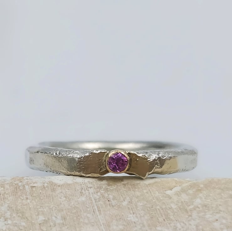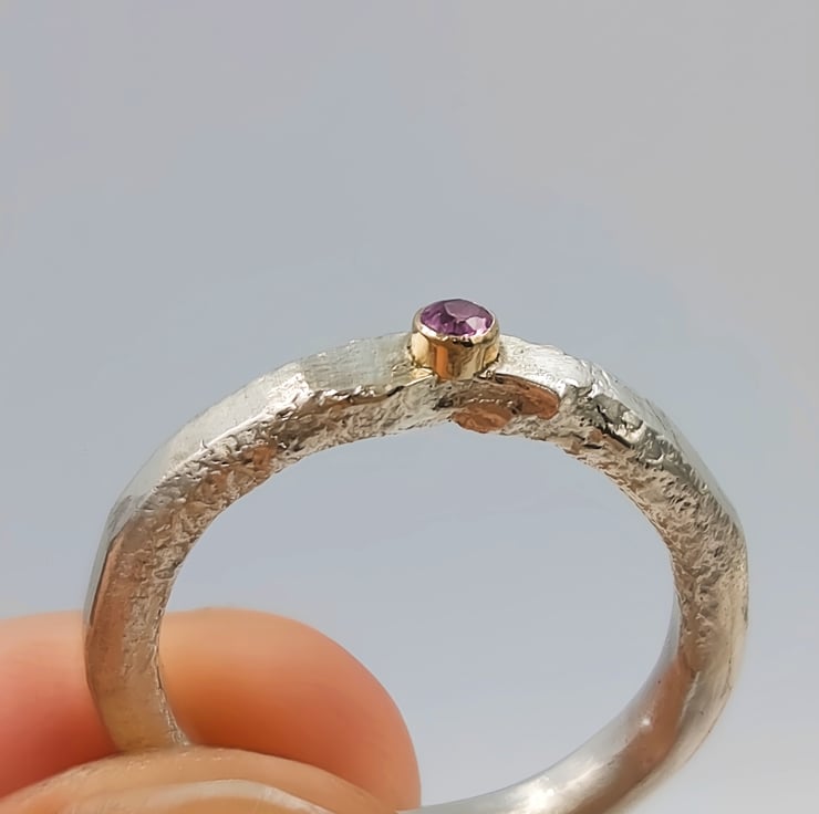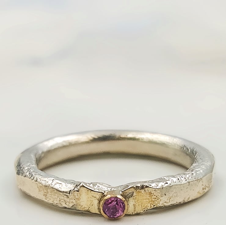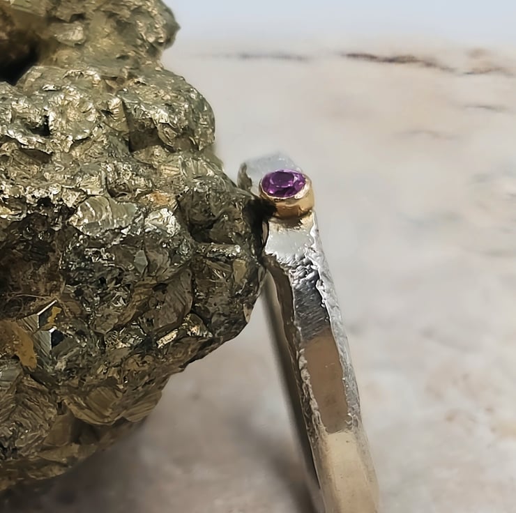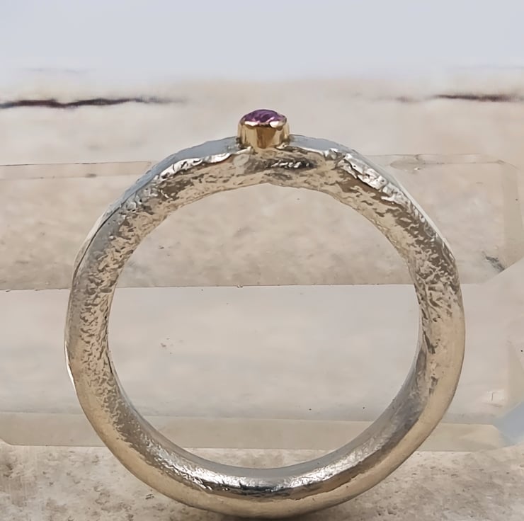 Capture attention with this stunning molten sterling silver ring, featuring a captivating 2mm pink sapphire set in a 14k gold tube. Its unique design effortlessly elevates any ensemble.