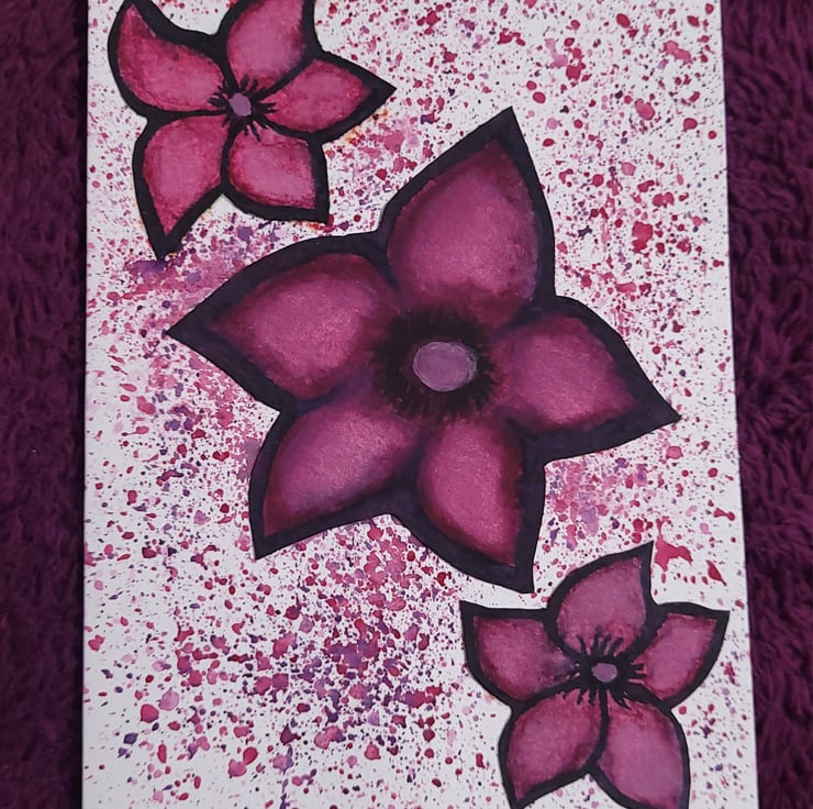 Handmade flower art pink, purple and black on a white A6 card using a combination of flowers cut out from card, watercolours and colouring felt tips.