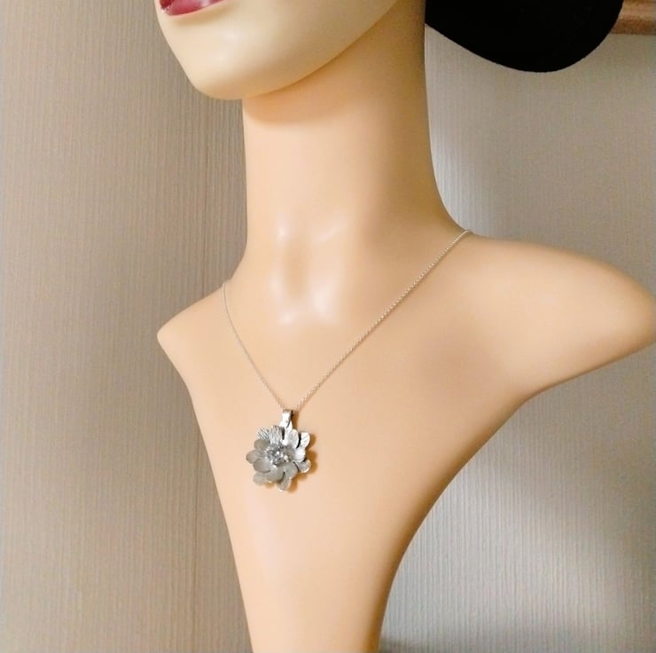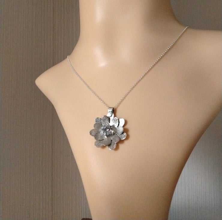 The flower measure 2.6 cm and a 7 mm clear CZ is claw set in the center, the pendant is suspended from a 18 inch sterling silver chain.