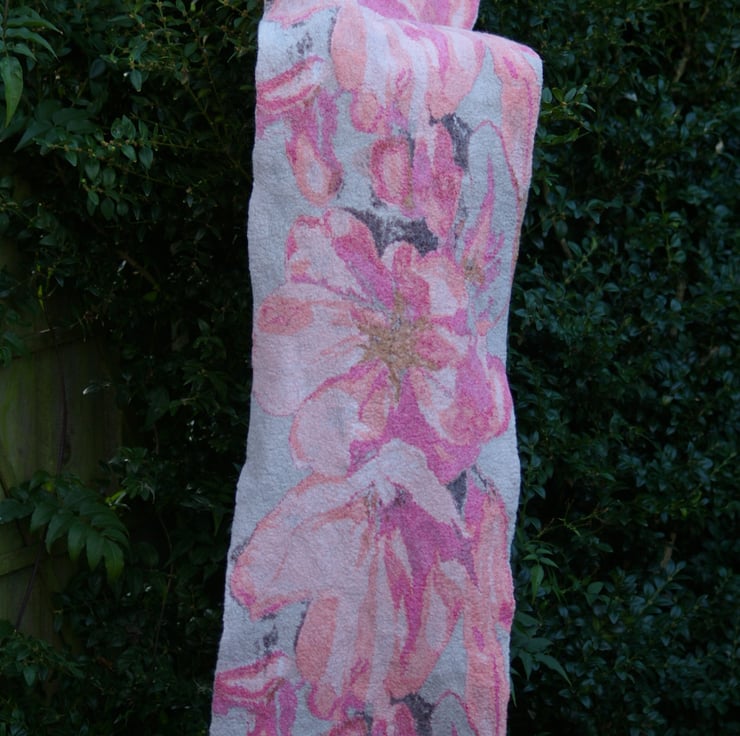 The scarf is made in nuno felting technique where soft merino wool is felted onto a delicate silk base creating a lightweight warm and beautifully textured accessory