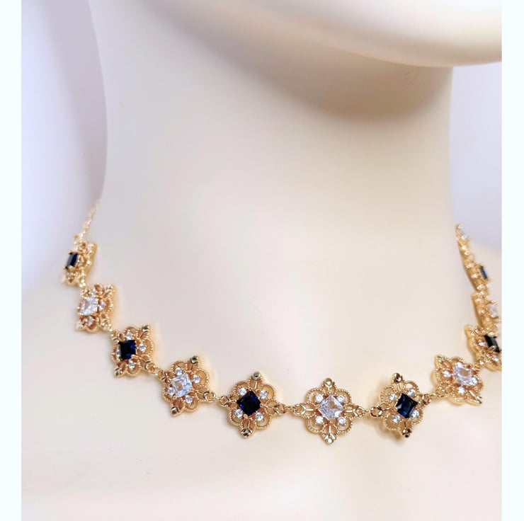 Beautiful sapphire blue and clear flower Victorian style choker in gold plating.