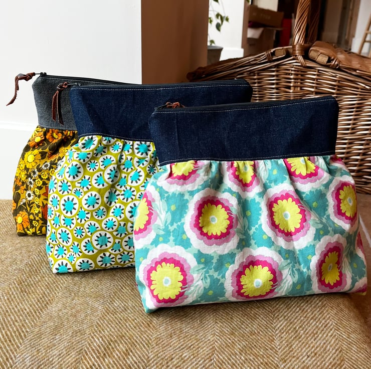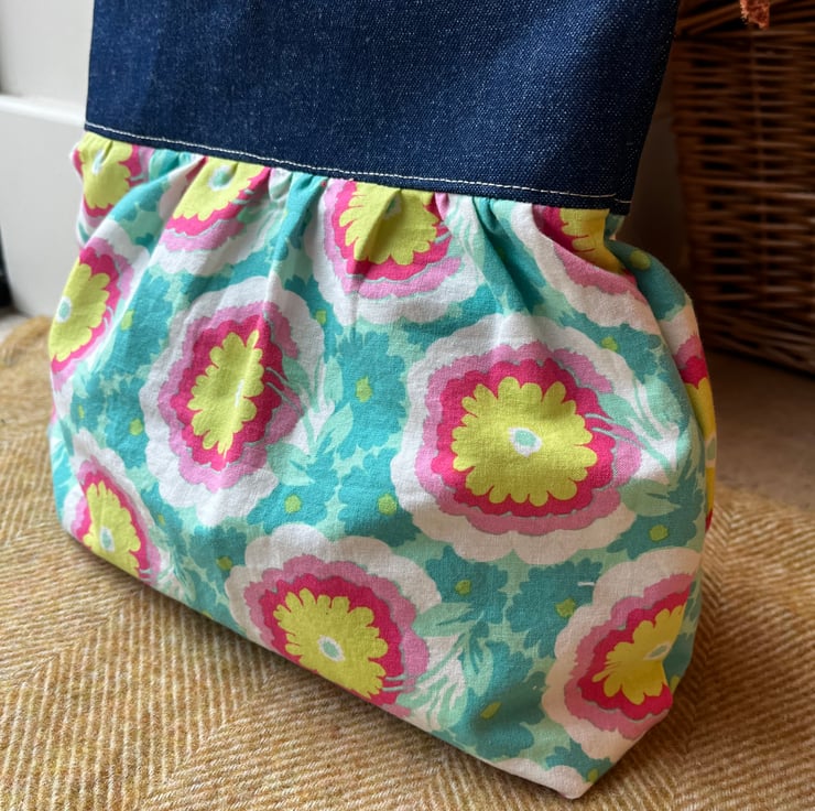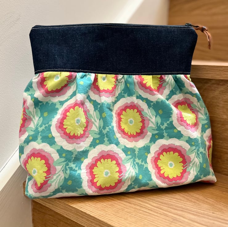 Zip pouch with a spacious gathered body made from pretty floral cotton and a band of dark denim. The bag is fully lined with thick cotton-mix gingham reclaimed from curtains.