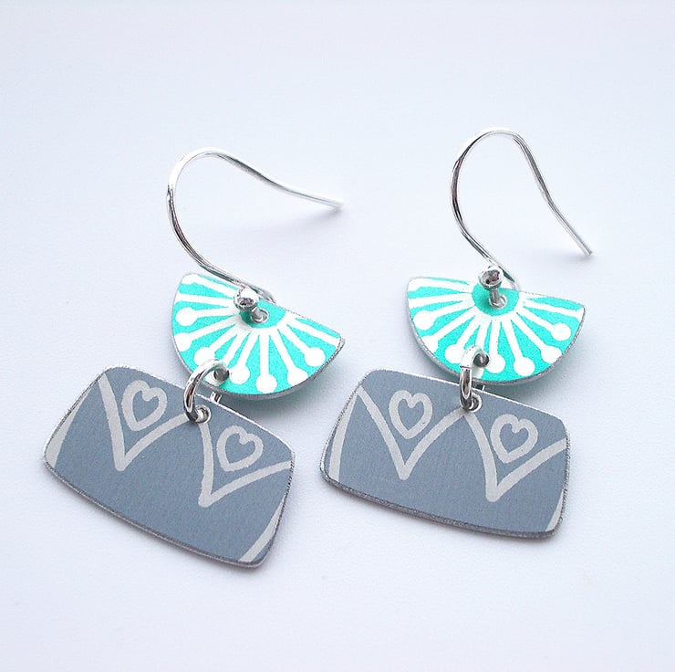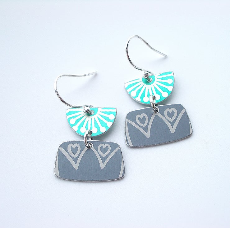 These mid century style earrings are made from anodised aluminium which I have dyed in jade and grey and printed with a starburst and retro flower design. I hand cut the rectangle and semi circle shapes by hand using a jeweller's piercing saw and file the edges to give a nice smooth finish. They dangle from sterling silver jump rings and hang from sterling silver ear hooks. The earrings measure approximately 20mm x 20mm.