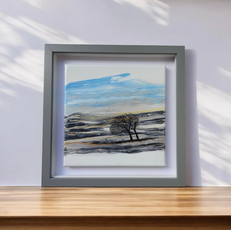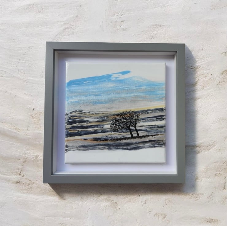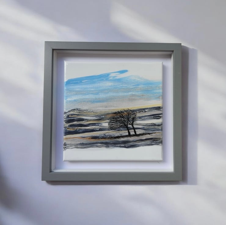 Depicting two winter trees on the hills bending in the wind on a winters day , golds , blues , silvers and greys shimmering in the cool sun .