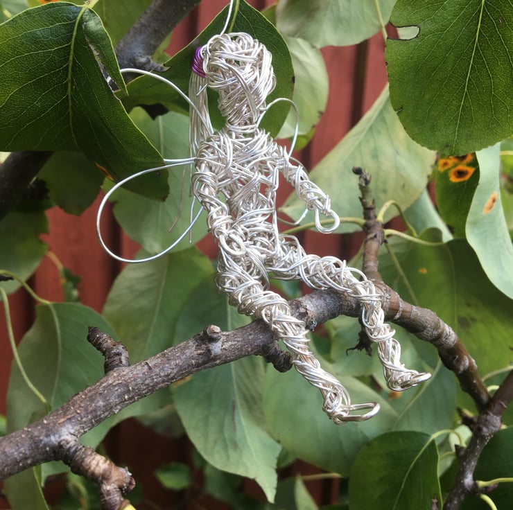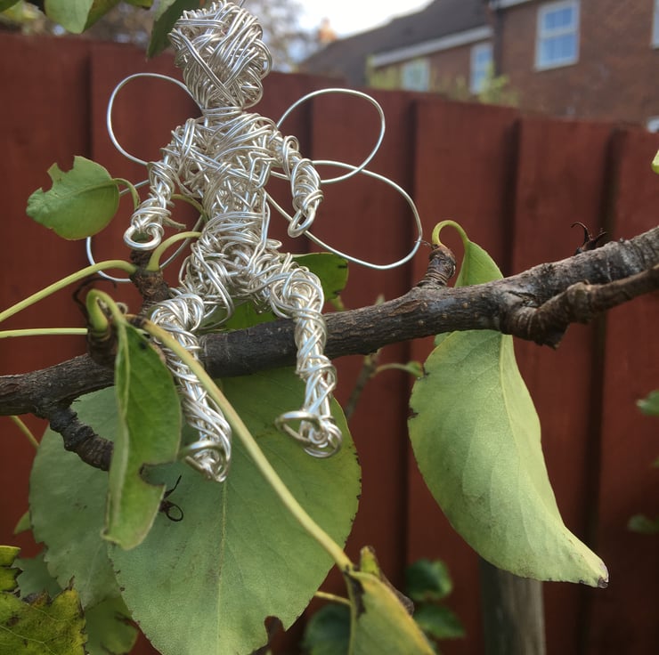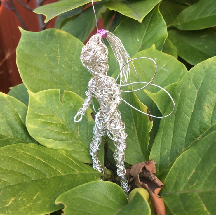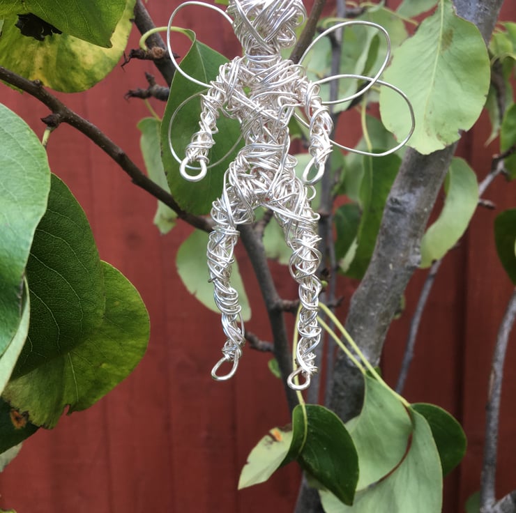 A beautiful fairy made with silver tone wire, made for indoors, but a sealant can be applied should you wish for it to live outdoors. The fairy measures approximately 12cm tall. She is made to order, so her hair bobble can be a different colour as well as her hair.