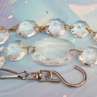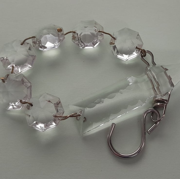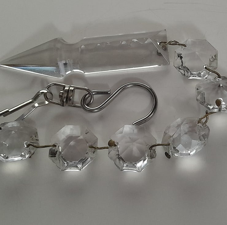 There are 6 x 15mm crystal octagons with a 26mm arrow pendent, with original wire connectors. A hook and clasp are to hang it.