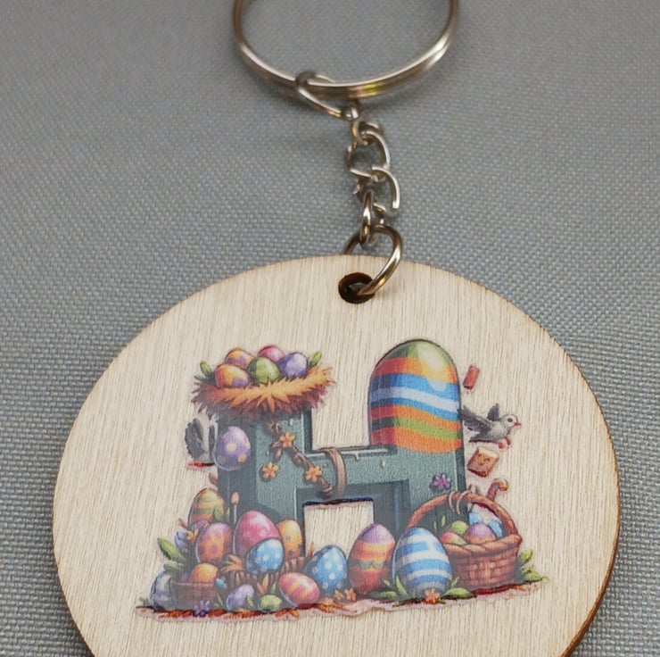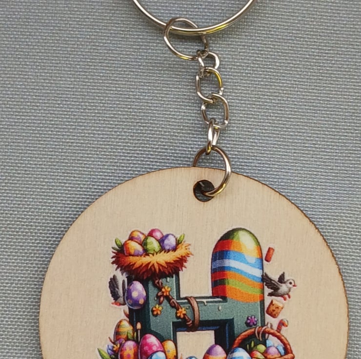 Easter keyring, made using a wooden disc and a uv dtf transfer of the letter H