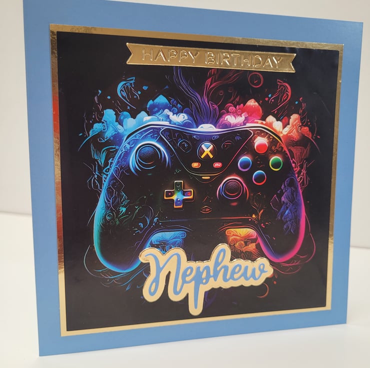 Level up your nephew’s birthday with this bold and vibrant gamer birthday card featuring a neon-style video game controller design. With rich blue and red tones, metallic gold accents, and “Happy Birthday Nephew” sentiments, this card is perfect for any gaming fan!