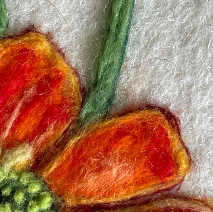 A hand felted Zinnia artwork crafted from merino wool. This unique textile piece captures the delicate features and colours seen in this beautiful flower, using the needle felting technique. The flower is ‘painted’ with wool, felted onto a natural base with added details to bring out the flowers characteristics. Every piece is completely handmade and unique, making it a lovely original gift for nature lovers, gardeners or anyone who loves the soft texture and warmth of textile art.