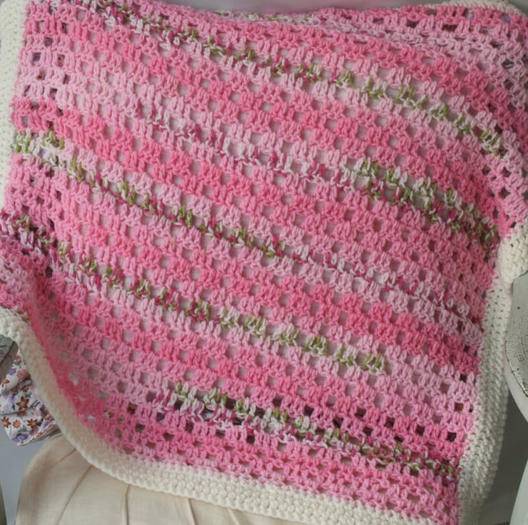 A really pretty filet crochet, blossom baby blanket. It is very soft and perfect for a little baby to keep snuggly and warm. It would be ideal as a christening gift, baby shower or new mum gift. It would also make a rather lovely springtime lap blanket for both indoors and outdoors, or a picnic lap blanket for instance. The blossom blanket has very pretty colours through it and a lovely cream shade border which gives it a knitted effect and a vintage-style feel to it. It is a special domestic crochet homeware item that has at it's heart, love and care.