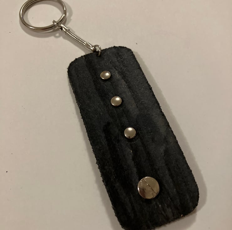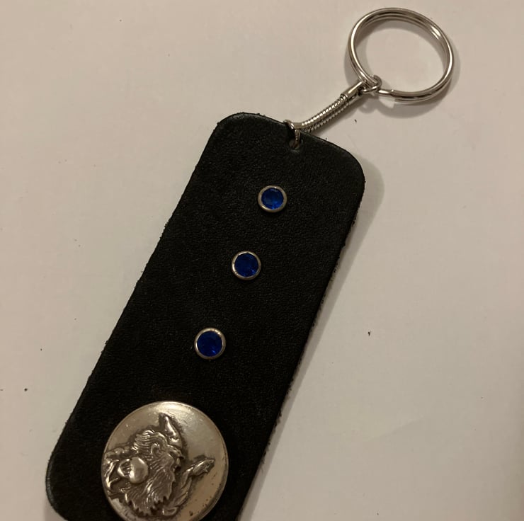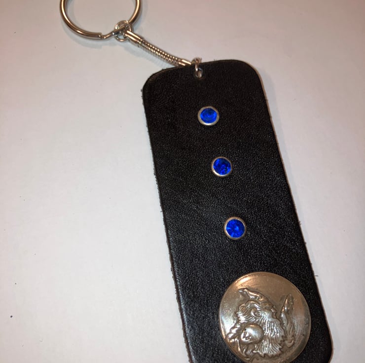 Black dyed Leather Keyring on chain with 3 Blue Gemstones & Mystical Wizard