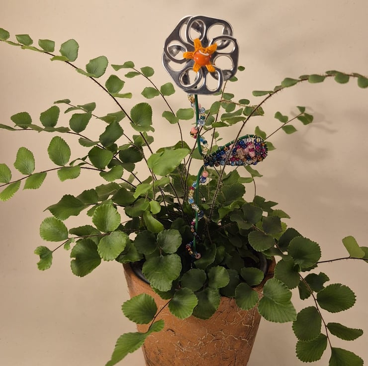 Made from upcycled aluminium can pulls, cotton embroidery floss and glass bead. The wire leaf and stem are wrapped in wire and glass beads.