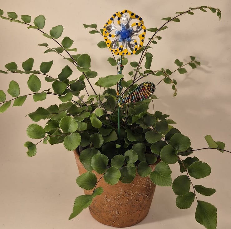 These flowers are perfect to accompany and brighten up your pot plants. Green stem with multi-colour glass beaded leaf and stem. You will find a wide variety of colours in my shop. Discount if you buy 3, or more.