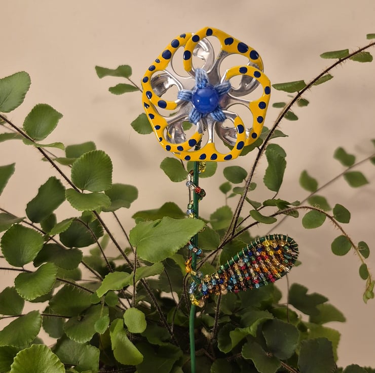 Made from upcycled aluminium can pulls, cotton embroidery floss and glass beads. The wire leaf and stem are wrapped in wire and glass beads.