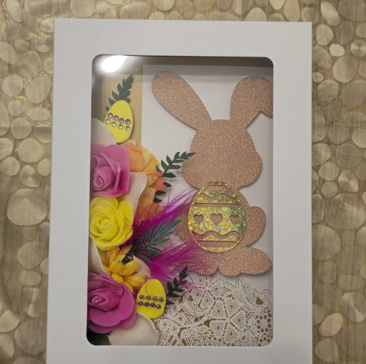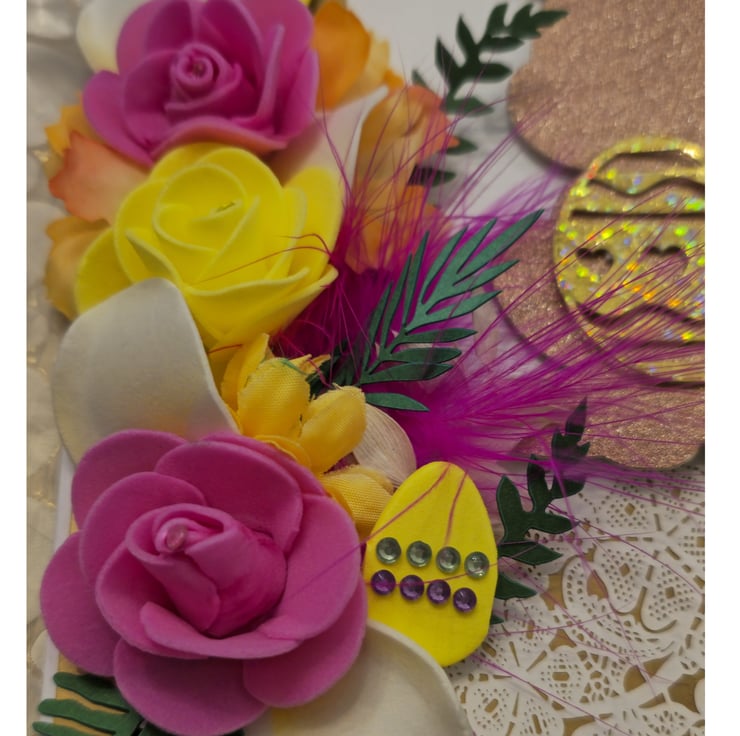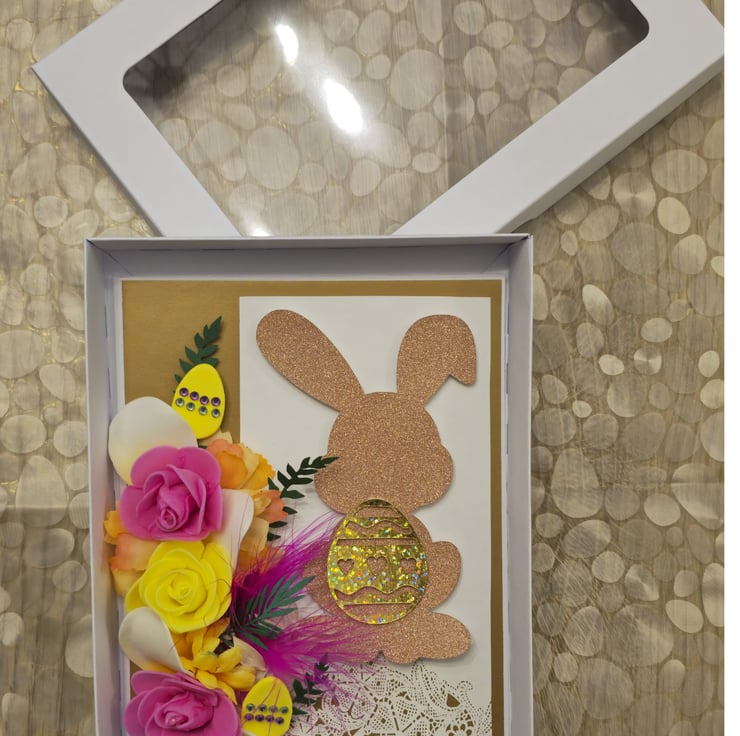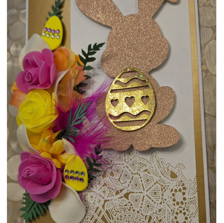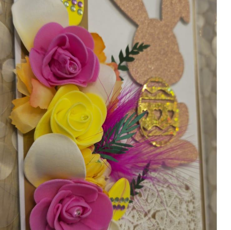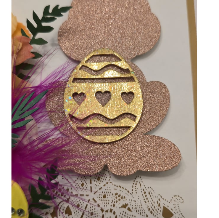 A beautifully handmade Happy Easter card designed to bring warmth, colour, and spring joy to someone special.