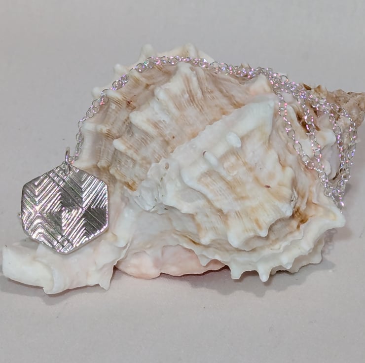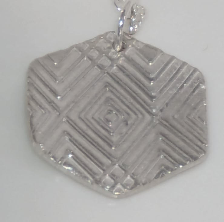 This lovely fine silver pendant is made using silver clay and textured to create the geometric pattern on the front. The chain is a 925 sterling silver 18 inch fine chain and also has a 925 sterling silver 2 inch extender chain. The pendant measures approx. 19 mm (H) x 19 mm (W).