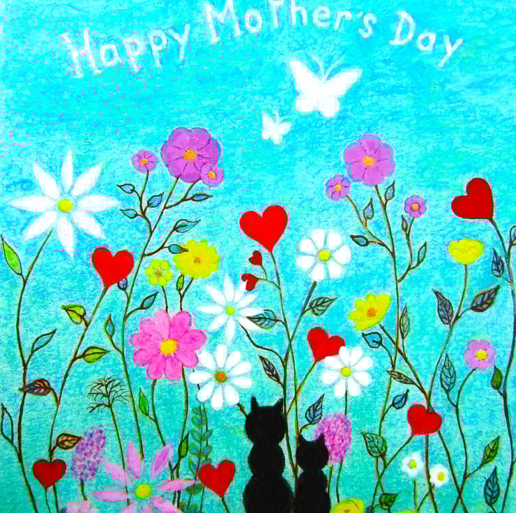 Mothers Day Flowers Card, Cats Butterflies Art, Black Kitten Hearts, Blank Card